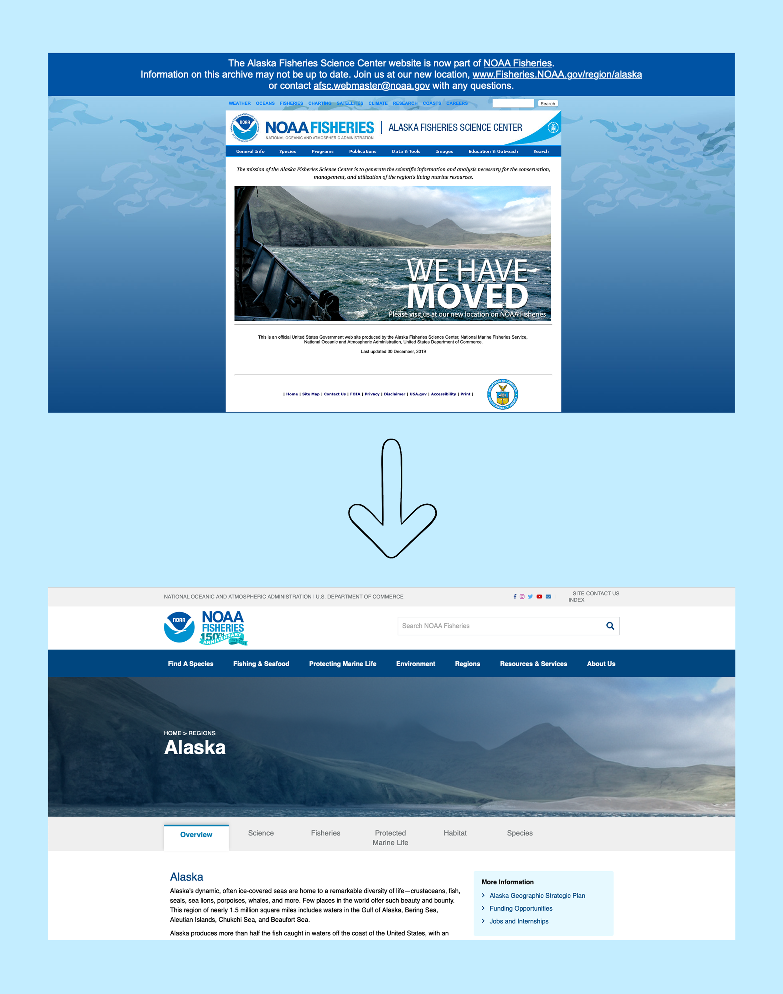NOAA Fisheries headquarters was encouraging all science centers, including AFSC, to migrate their individual websites (AFSC Archive website, top) to the national NOAA Fisheries website (bottom).