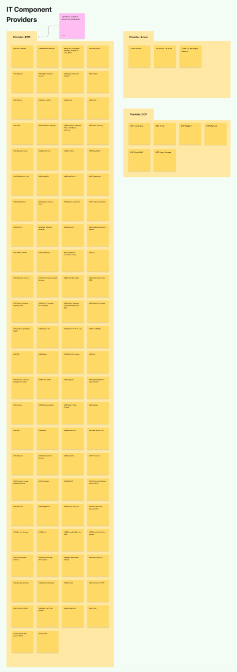 One of the challenges we uncovered during this card sort was the “stupidly long list” of AWS IT Components, which dwarfed the list of components from Azure and Google Cloud Platform (GCP). Our initial thoughts were to use a typeahead search to deal with this list.